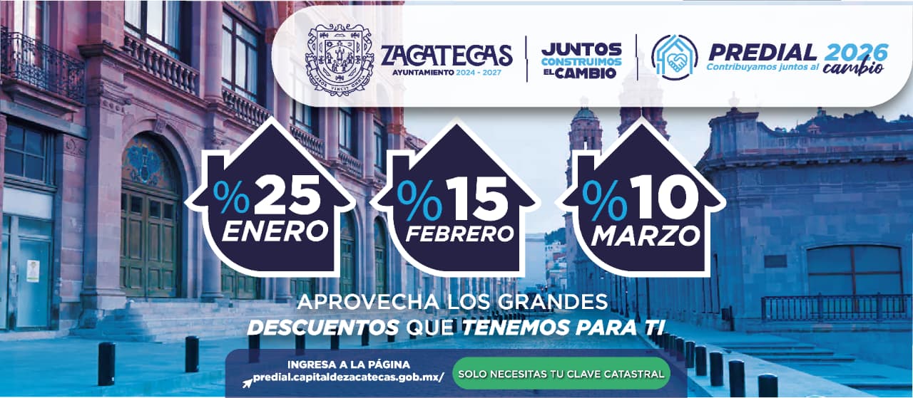 El Ayuntamiento de Zacatecas recuerda a la ciudadanía que durante los meses de enero, febrero y marzo se aplican descuentos por pronto pago en el impuesto predial del 25, 15 y 10 por ciento, respectivamente, como una medida de apoyo a la economía familiar y un incentivo para fortalecer las finanzas municipales. La administración municipal invita a la ciudadanía a aprovechar estos beneficios y a acudir a la sede que resulte más conveniente, reiterando su compromiso de ofrecer un servicio eficiente, cercano y ordenado a las y los zacatecanos.