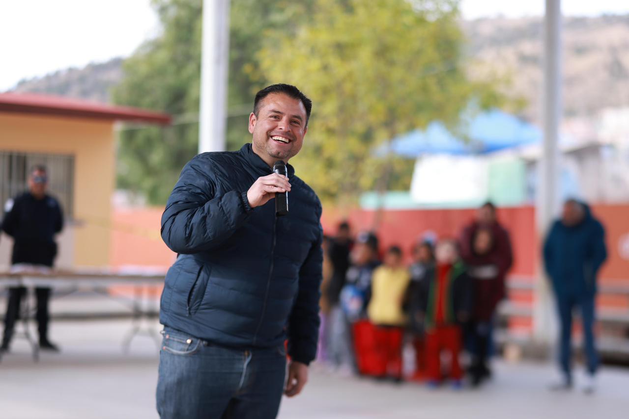 Durante su visita a la Primaria Francisco Goitia, en el Barrio de los Olivos, el primer edil participó en la ceremonia de honores a la bandera. Tras el acto cívico, atendió la gestión del cuerpo docente, quienes solicitaron el cercado perimetral de la cancha de fútbol.