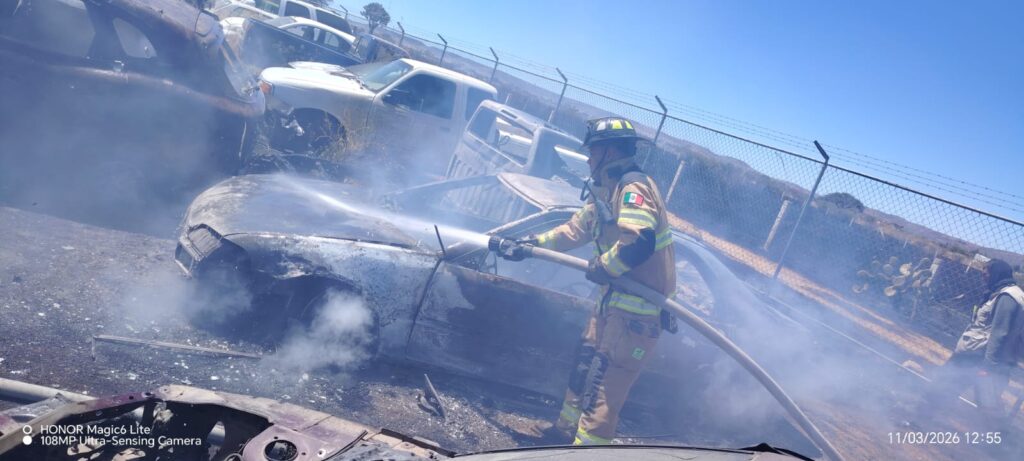 Incendio controlado de 12 vehículos, caja de tráiler y material plástico en el corralón fiscalía, carretera 181 kilómetro 5.6 rancho el Carmen