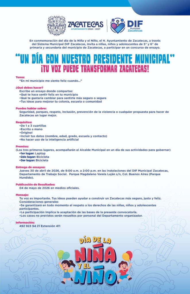 El certamen promueve el pensamiento crítico y el liderazgo entre niñas, niños y adolescentes, quienes podrán compartir su perspectiva sobre el entorno que los rodea. Los interesados deben consultar las bases completas para cumplir con los requisitos de formato y contenido establecidos por la administración municipal.